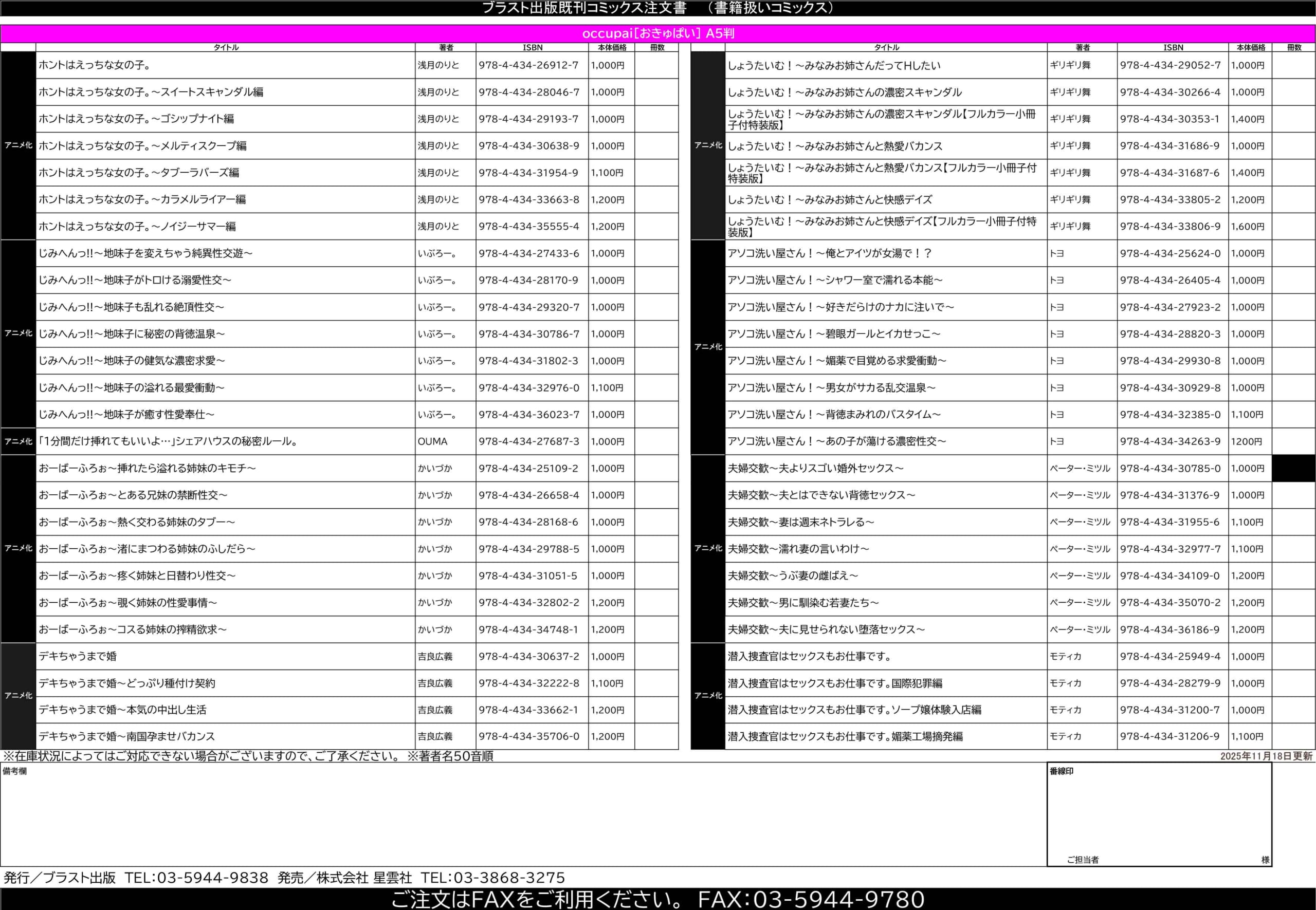 ブラスト出版で発行しているコミックスの注文書を下記よりダウンロードすることができます。